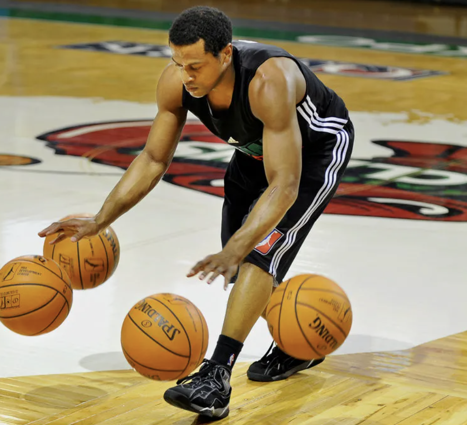 Tyc Snow dribbling four basketballs at Maine Red Claws.